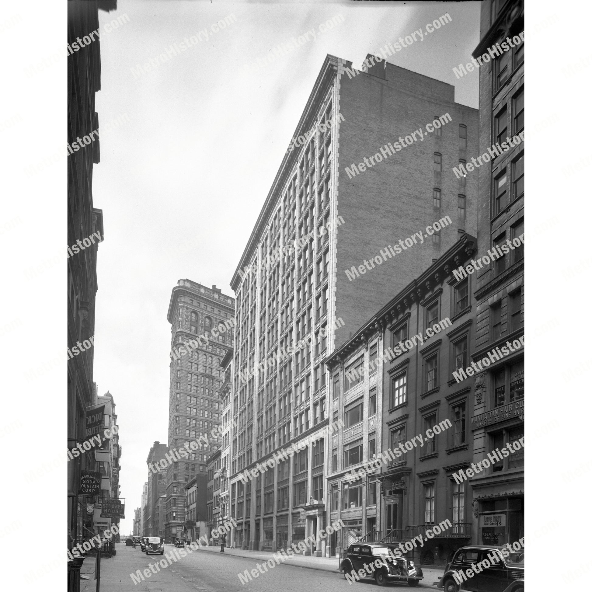 1938 photograph of 13-21 East 22nd Street on north side of East 22nd Street between Broadway and Park Avenue South in Manhattan, New York City. Signage reads "Consolidated Soda Fountain Corp.," "Dick's Struben House, Restaurant," and "Regal Candy Stores Co."