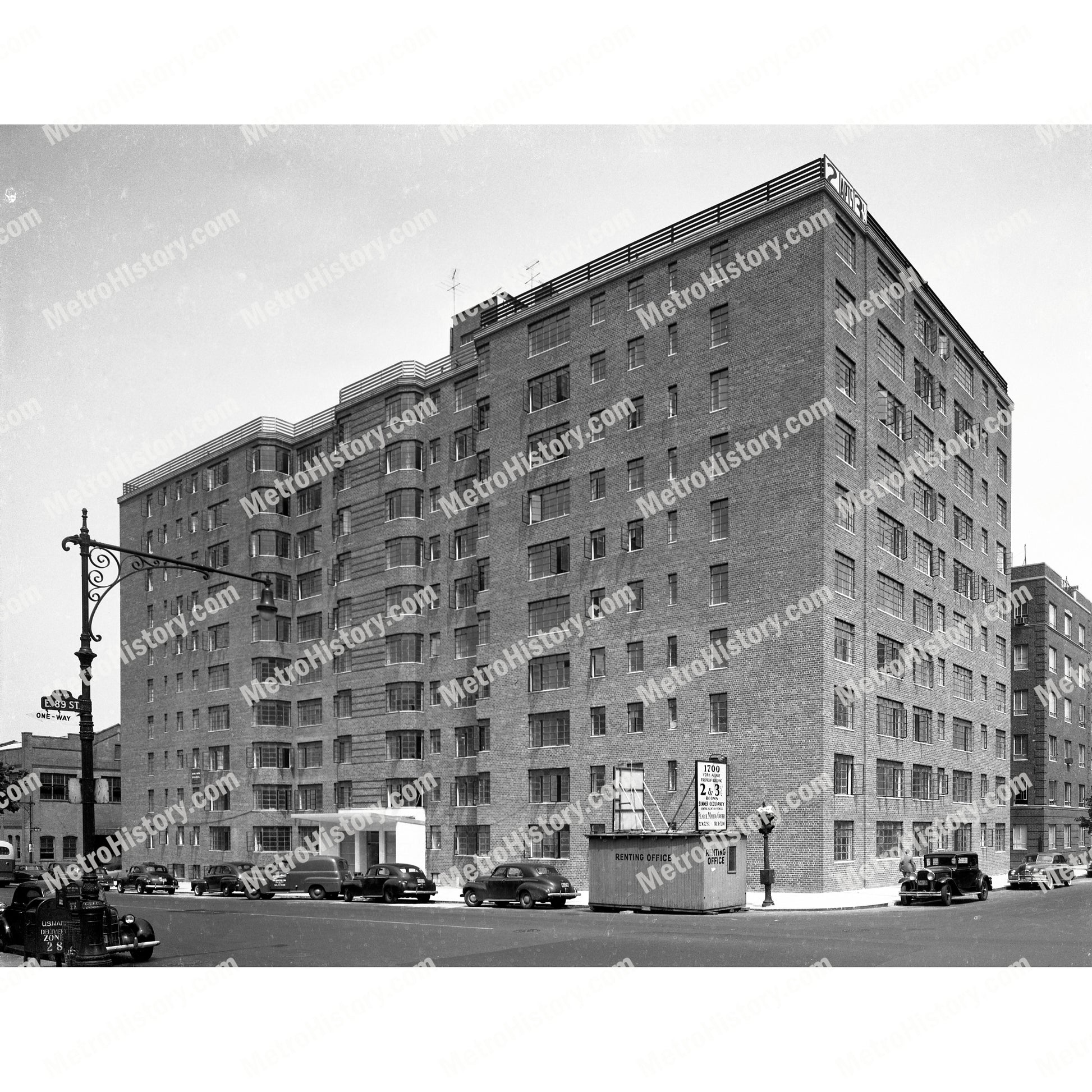 1951 photograph of 1700 York Avenue at northeast corner of East 89th Street running to East 90th Street in Manhattan, New York City. Signage reads "1700 York Avenue, Fireproof Building, 2 & 3 Rooms, Summer Occupancy, Renting Agent On Premises, Pearce, Mayer & Greer" and "Renting Office."