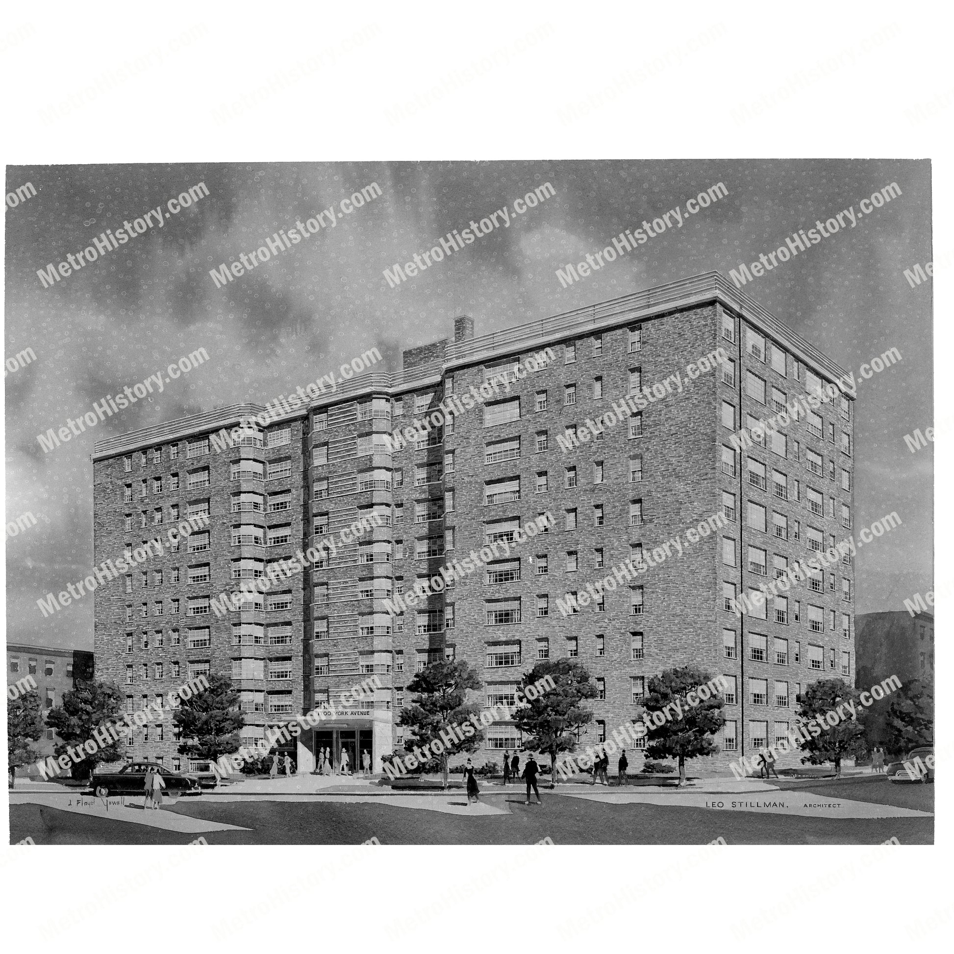 1951 rendering of 1700 York Avenue at northeast corner of East 89th Street running to East 90th Street in Manhattan, New York City. Rendering reads "Leo Stillman, Architect."