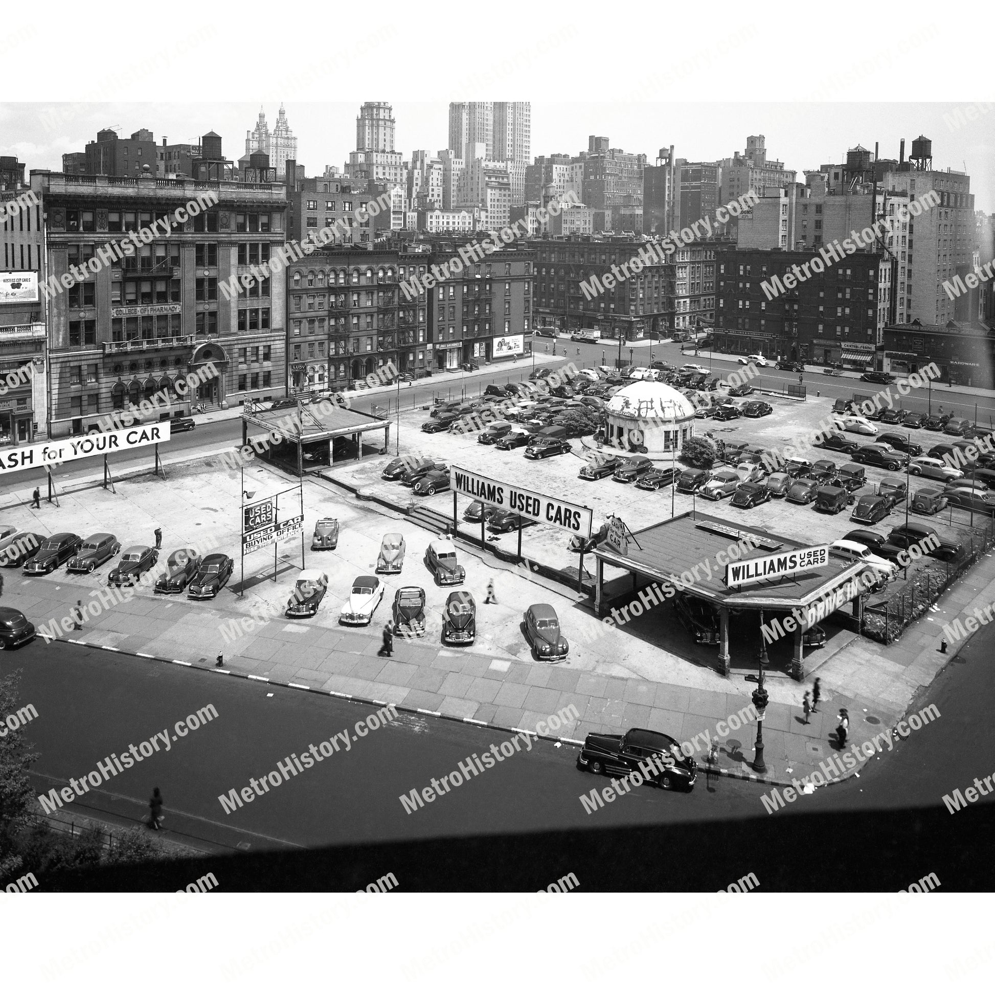 1945 photograph of parking lot at 1980-1988 Broadway at northeast corner of West 67th Street running to West 68th Street in Manhattan, New York City. Signage reads "Williams Used Cars."