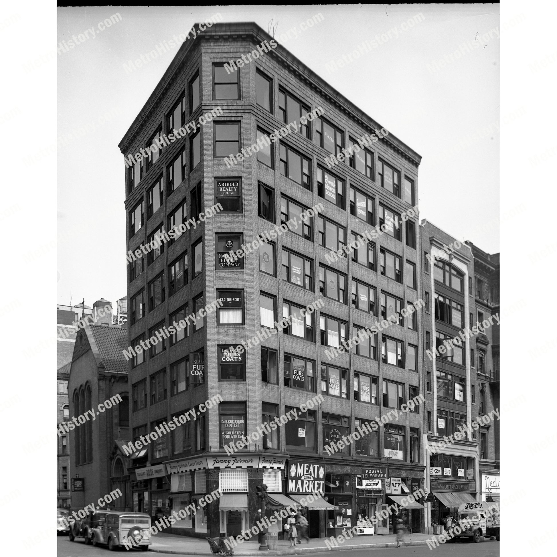 1941 photograph of 2061-2067 Broadway at northwest corner of West 71st Street in Manhattan, New York City. Signage reads "Arthold Realty Co., Inc.," "National Biscuit Company," "Carlton-Scott Inc.," "L. Sussman Furs Coats," "Dr. B. Kreisberg Dentist," "A. Goldstein Podiatrist," "Fanny Farmer Candy Shops," and "Hungarian Pastry Shop."