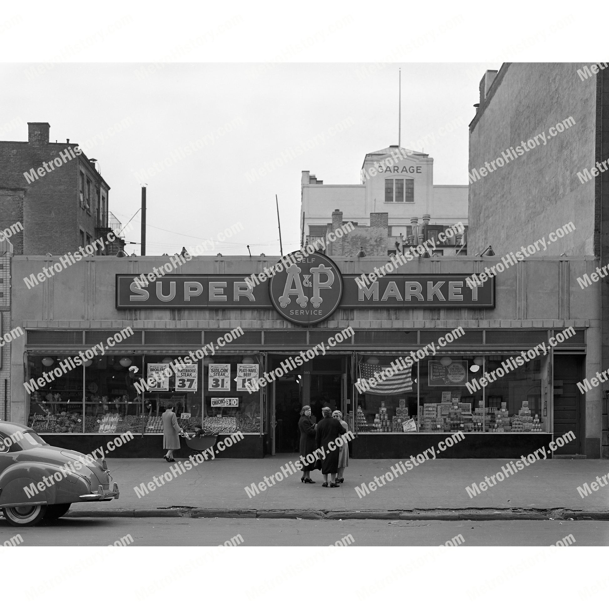 1942 photograph of 303-305 East 79th Street on north side of East 79th Street between Second Avenue and First Avenue in Manhattan, New York City. Signage reads "A&P Self Service Super Market."