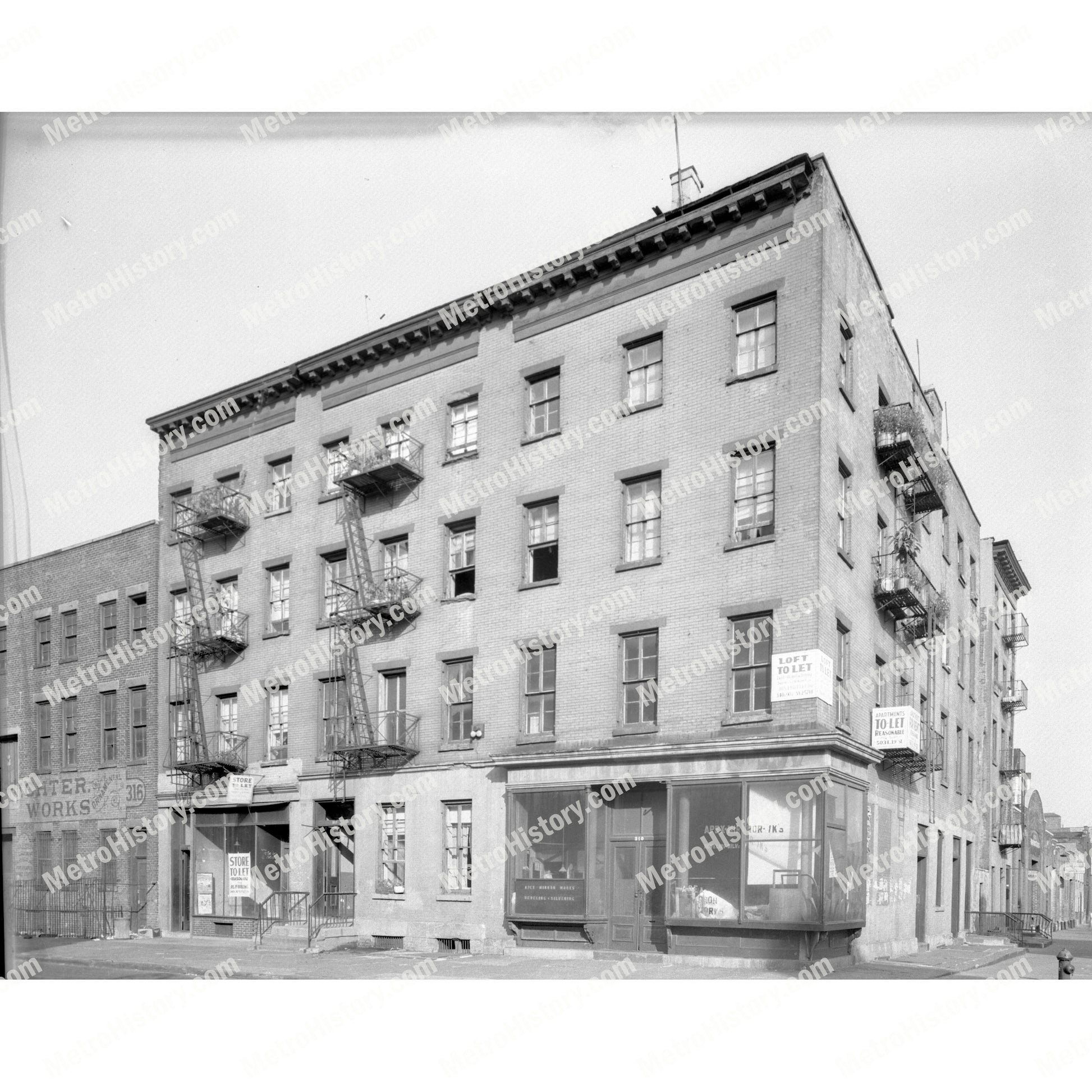 1936 photograph of 310-314 Avenue A at northeast corner of East 19th Street in Manhattan, New York City. Signage reads "Apex Mirror Works." This is the present-day site of the Stuyvesant Town (or StuyTown) apartment complex.