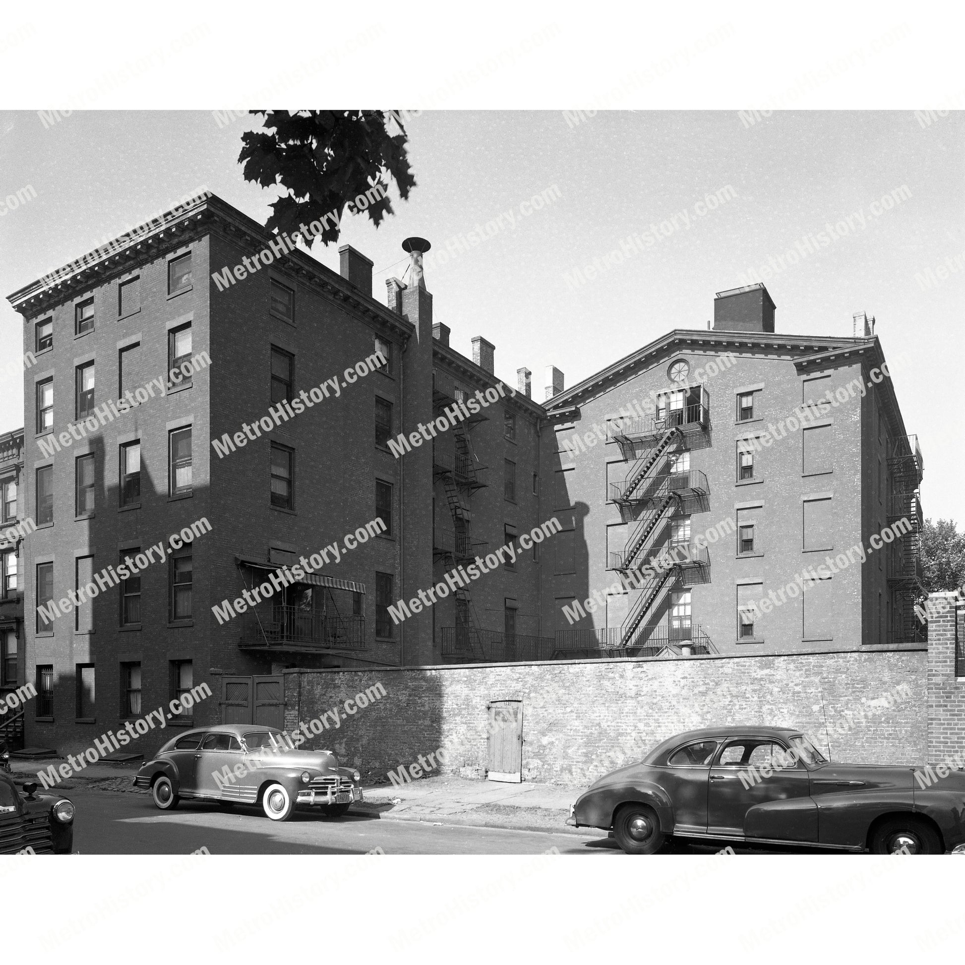 1951 photograph of rear of 320 Washington Avenue on west side of Washington Avenue between Dekalb Avenue and Lafayette Avenue in Brooklyn, New York City. View is from Waverly Avenue.