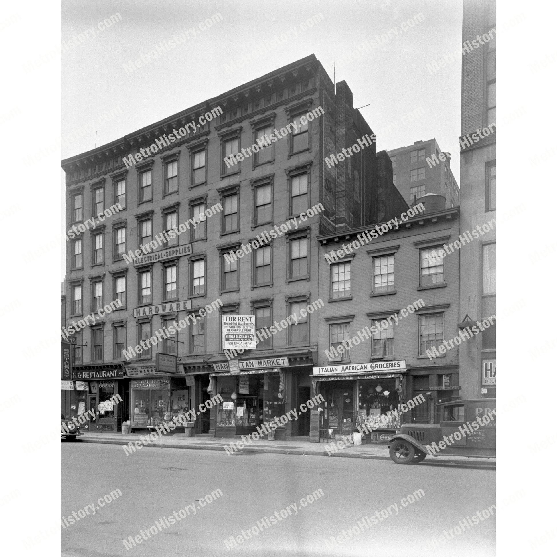 1936 photograph of 328-334 Eighth Avenue on east side of Eighth Avenue between West 26th Street and West 27th Street in Manhattan, New York City. Signage reads "Manhattan Market" and "Italian American Groceries."