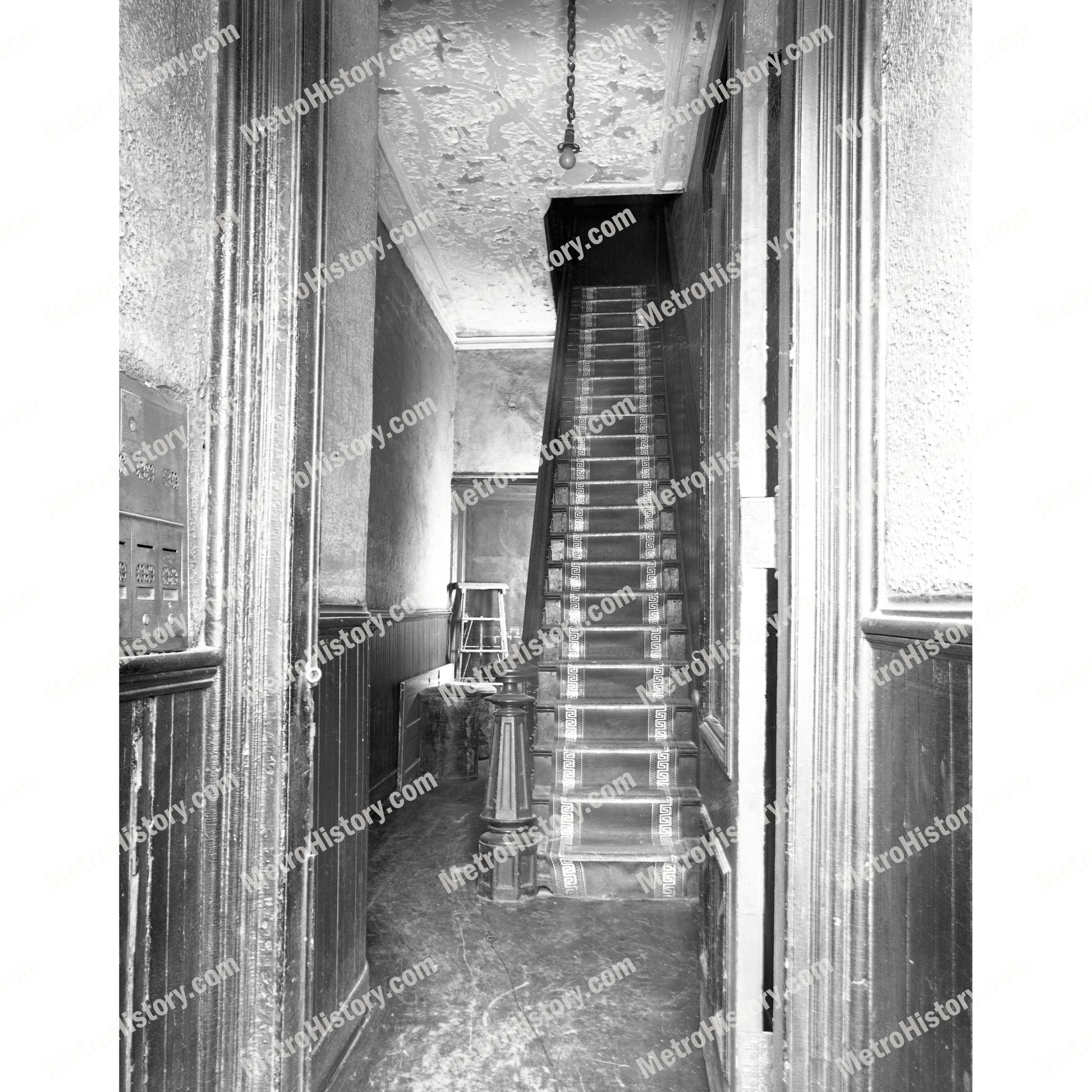 1936 photograph of hall interior at 328-334 Eighth Avenue on east side of Eighth Avenue between West 26th Street and West 27th Street in Manhattan, New York City.