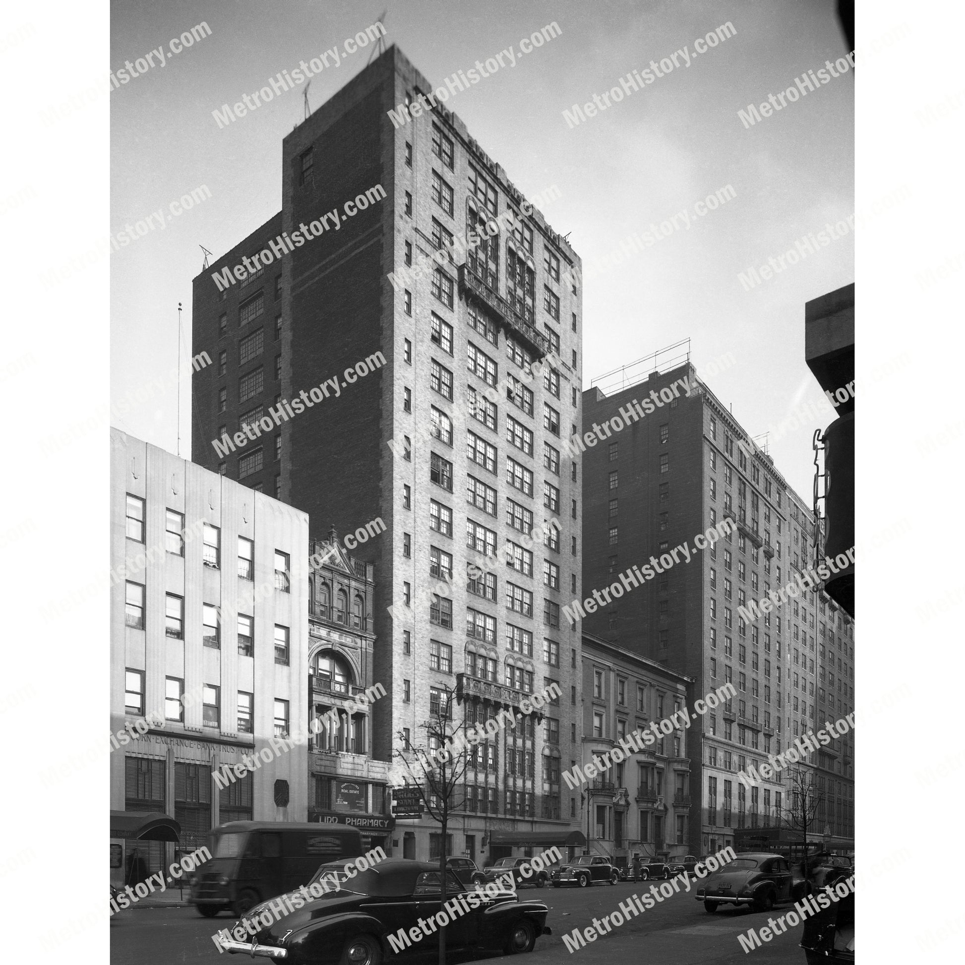 1946 photograph of 51 West 86th Street on north side of West 86th Street between Central Park West and Columbus Avenue in Manhattan, New York City. Signage reads "Corn Exchange Bank Trust Co." and "Lido Pharmacy, Drugs Soda, Luncheon."