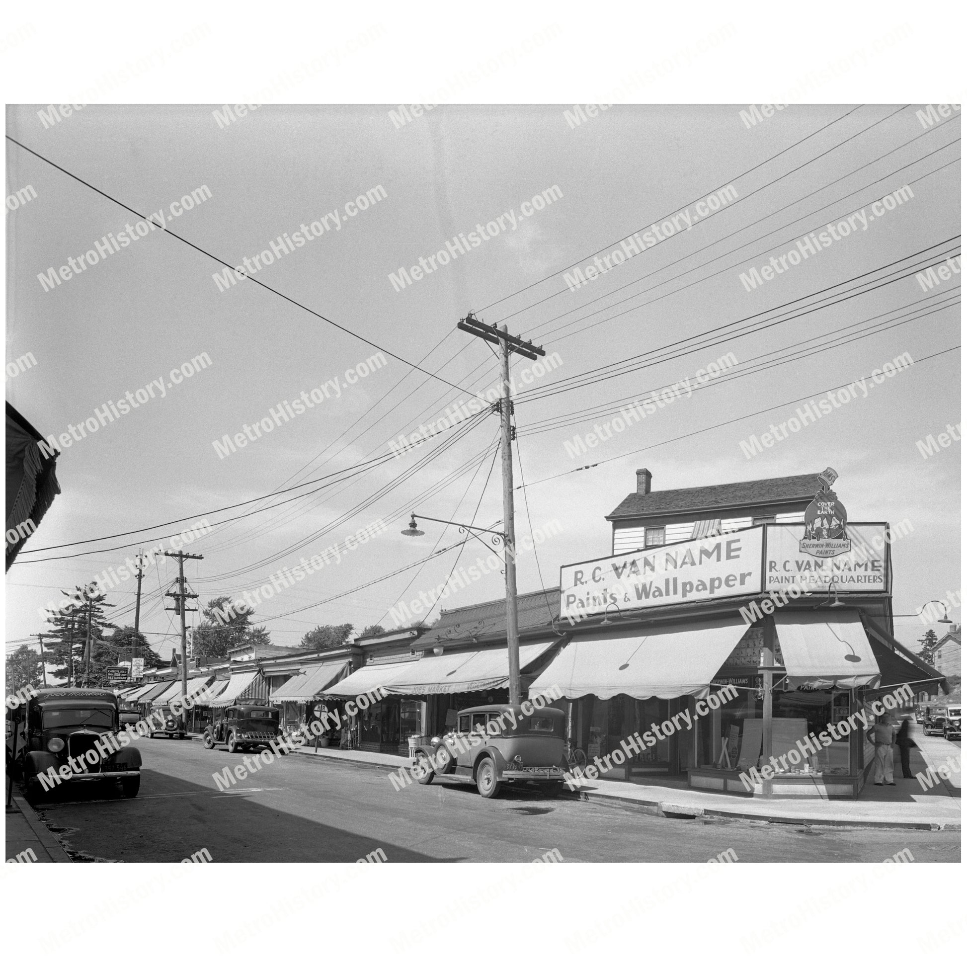 1936 photograph of east side of Giffords Lane between SIRR and Amboy Road in Great Kills, Staten Island, New York City. Signage reads "R.C. Van Name Paints & Wallpaper" and "Cover the Earth, Sherwin-Williams Paints."